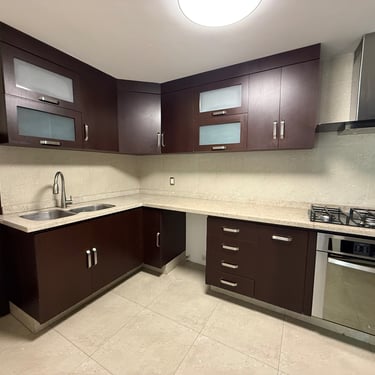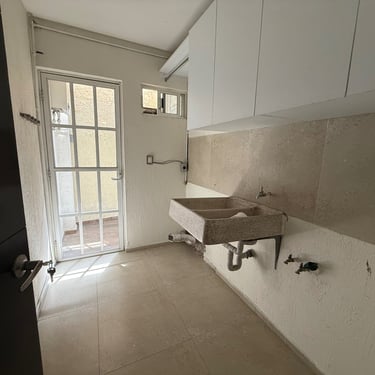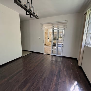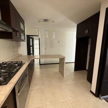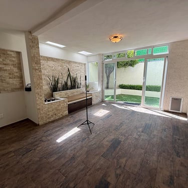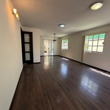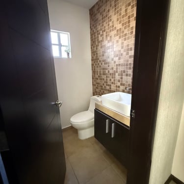 Primer Planta: Estacionamiento para dos autos, sala, comedor, medio baño de visitas, cocina integral, área de lavado y patio trasero amplio.